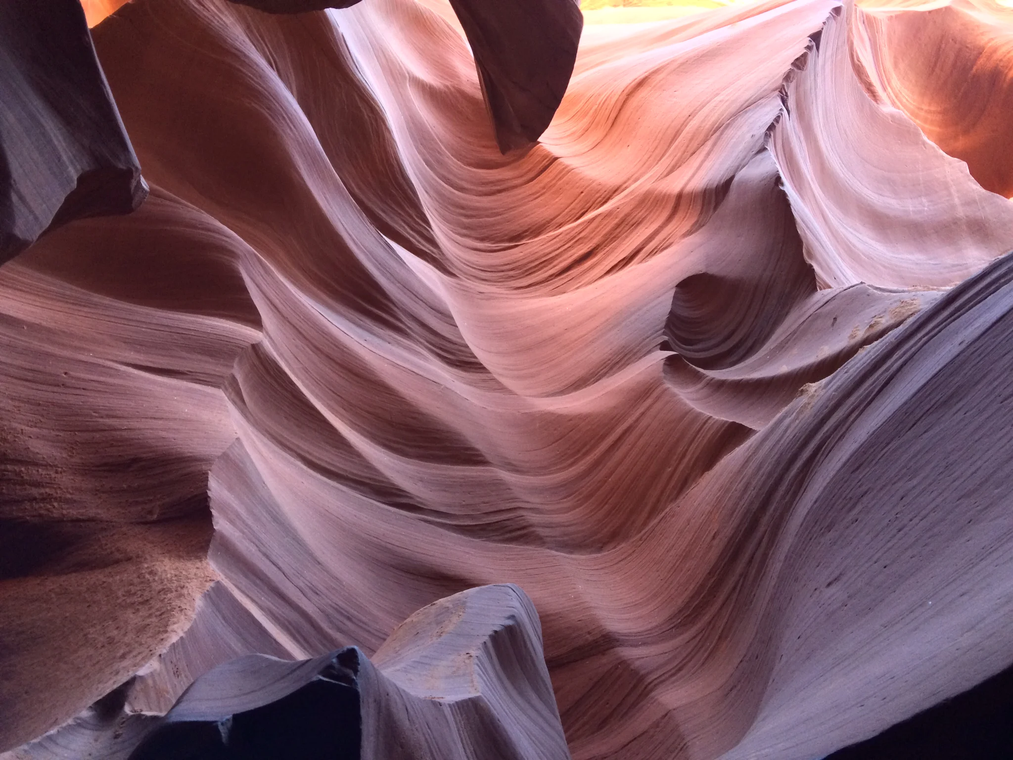 And look!—Sunlight slips into the canyon, and now the walls shadow and shape, shading yellow and lilac and pink as though we are watching a secret rehearsal for sunset.