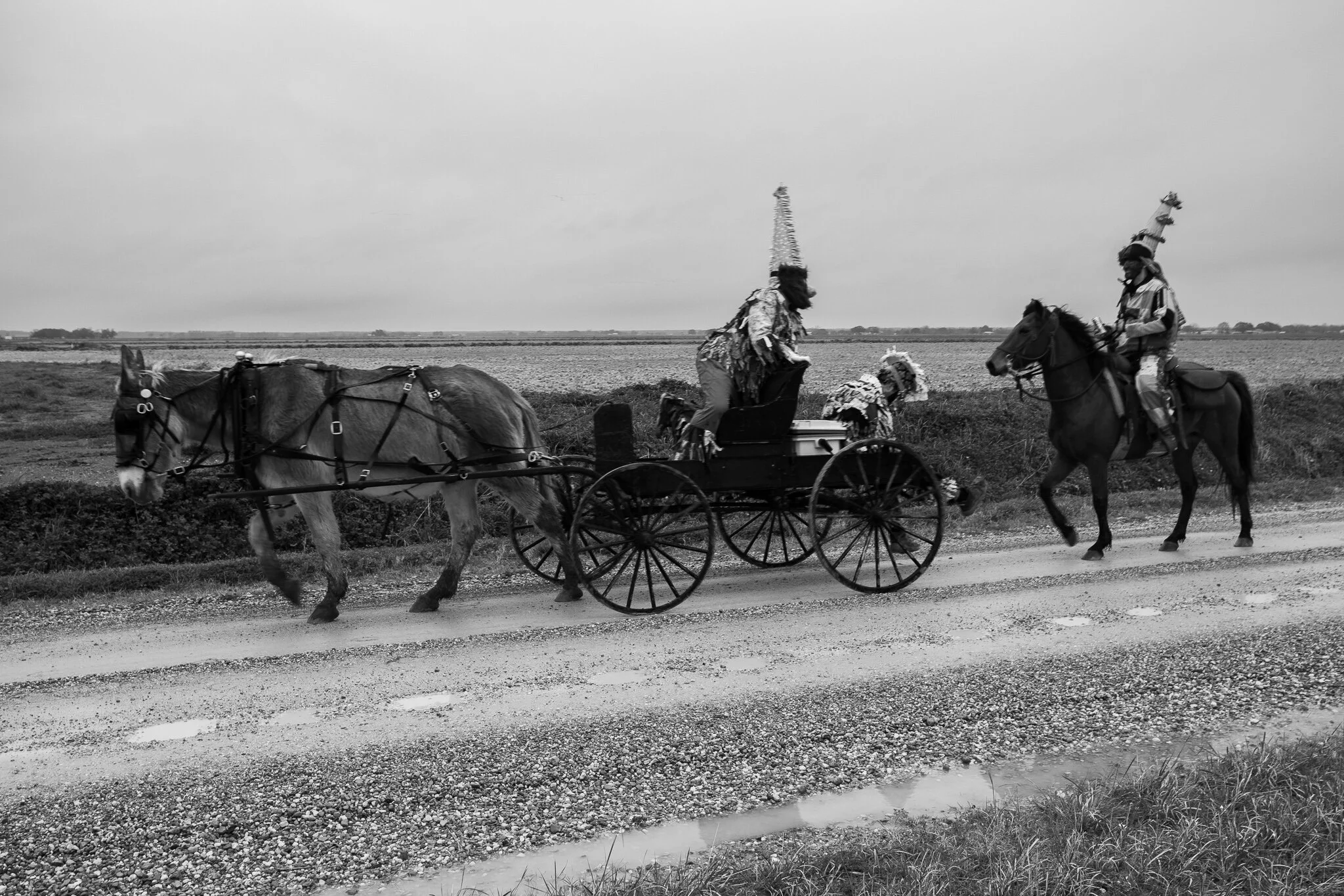On foot and horseback, with the occasional truck and trailer on which musicians ride, the trajectory of a Courir carries the charge of an epic. Shortly after sunrise, a priest prays over the capitaines, musicians and Mardi Gras. The procession then sets off into the countryside. Amidst the column of revelers, trucks pull small trailers on which musicians play fiddles, accordions, guitars and triangles, or, in local patois, ’tit-fers. On they move through the flat landscape of crawfish ponds that, in a different season, farmers transform into rice fields. All the while, they head toward homes where friends and family await.